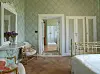 There are many wonderful original features – the imposing fireplace in the salon made from green African marble, the original marble floors and terracotta tiling, the lake, and, of course, the trees. Then you have the renovation done in 1910 in the art nouveau style including the staircase, the frieze in the salon and the bathroom tiles moved from the master suite to the apartment bathroom, this was the style we wanted to build on for beauty and authenticity.